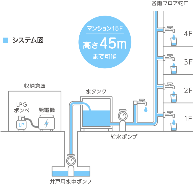 大地震などの災害等で停電・断水になっても、発電機、LPGとポンプでマンションの各フロアまで生活用水を供給することができるシステム、それが「防災オアシス計画」です。