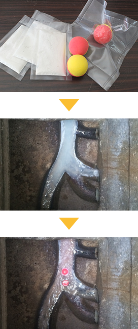 色素剤と固体が1セット。マンション高層階からの試験でも、汚水枡内を流れる色素を含んだ白い水、固体共に識別できました。